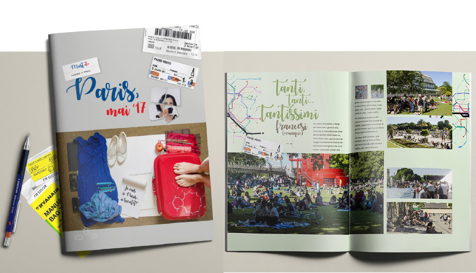 E’ una brochure di 32 pagine con una grafica piuttosto dinamica (io a Parigi… non poteva essere niente di triste, rigido o serioso!) divisa in 9 capitoli trasversali, molte foto e qualche testo (privato).