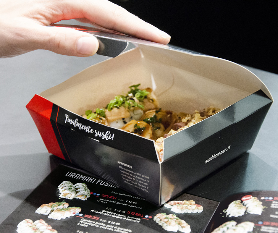 E’ stato studiato anche il pack per il servizio take-away con shopper in carta e scatoline alimentari