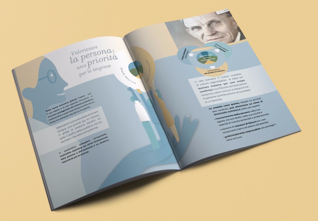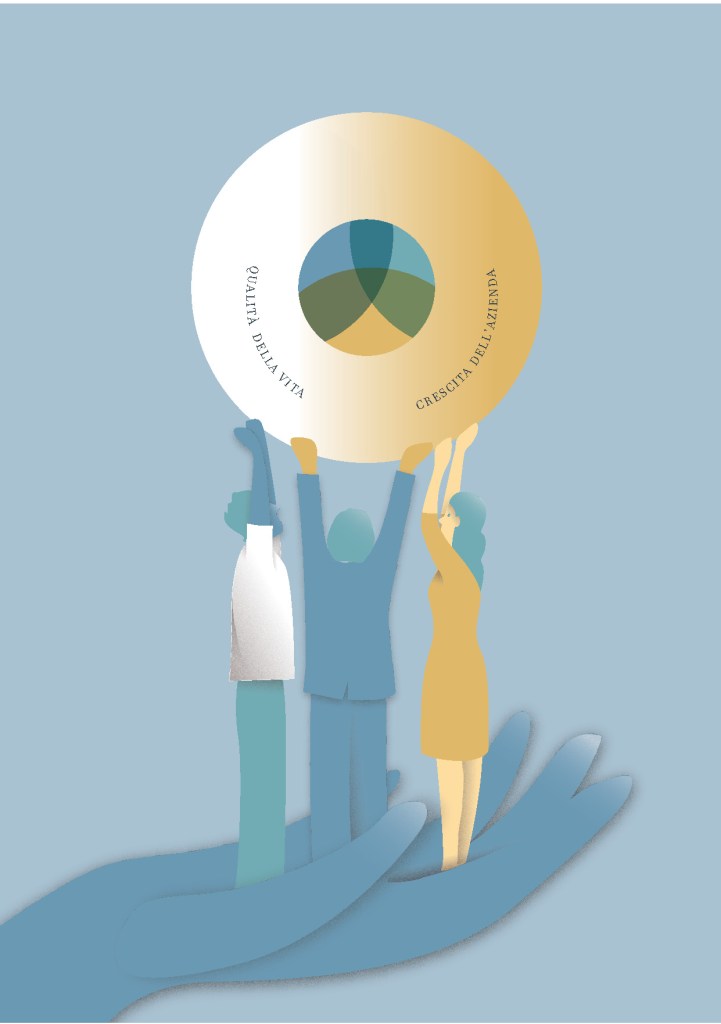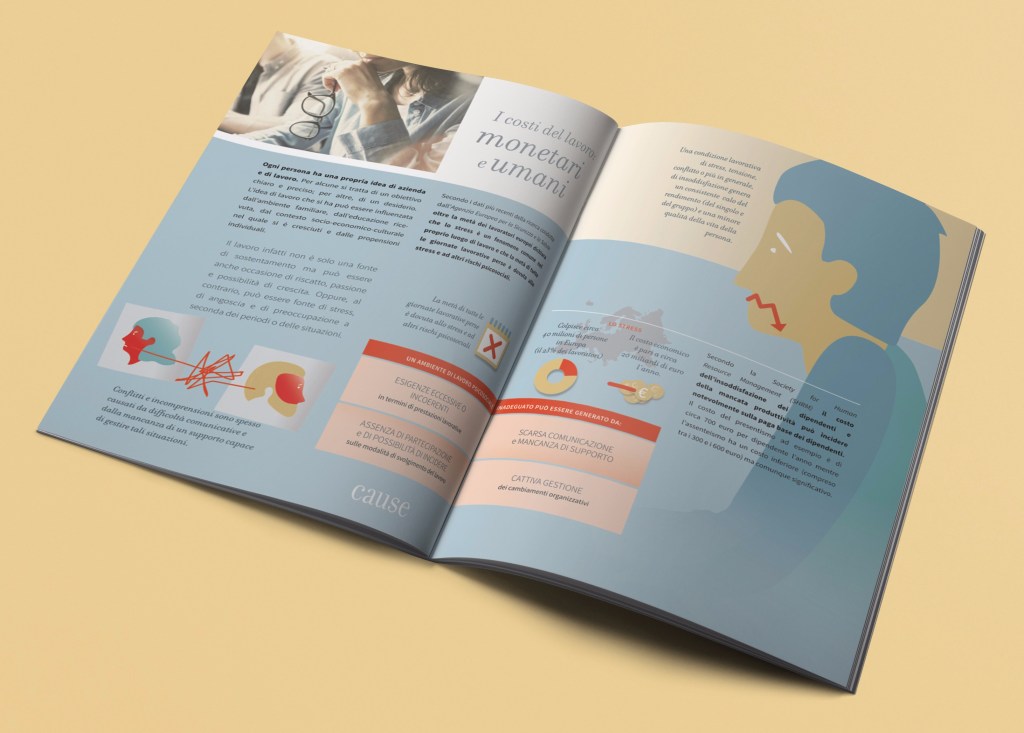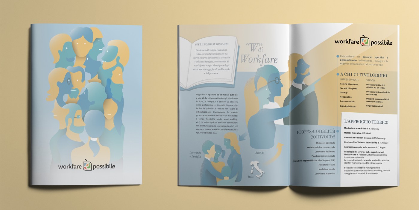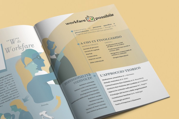 L’argomento “Workfare aziendale” oscilla tra dati tecnici e vissuti emotivi individuali così la grafica scelta va nella direzione di sottolineare una certa morbidezza (di ascolto, di interazione, di accoglienza).