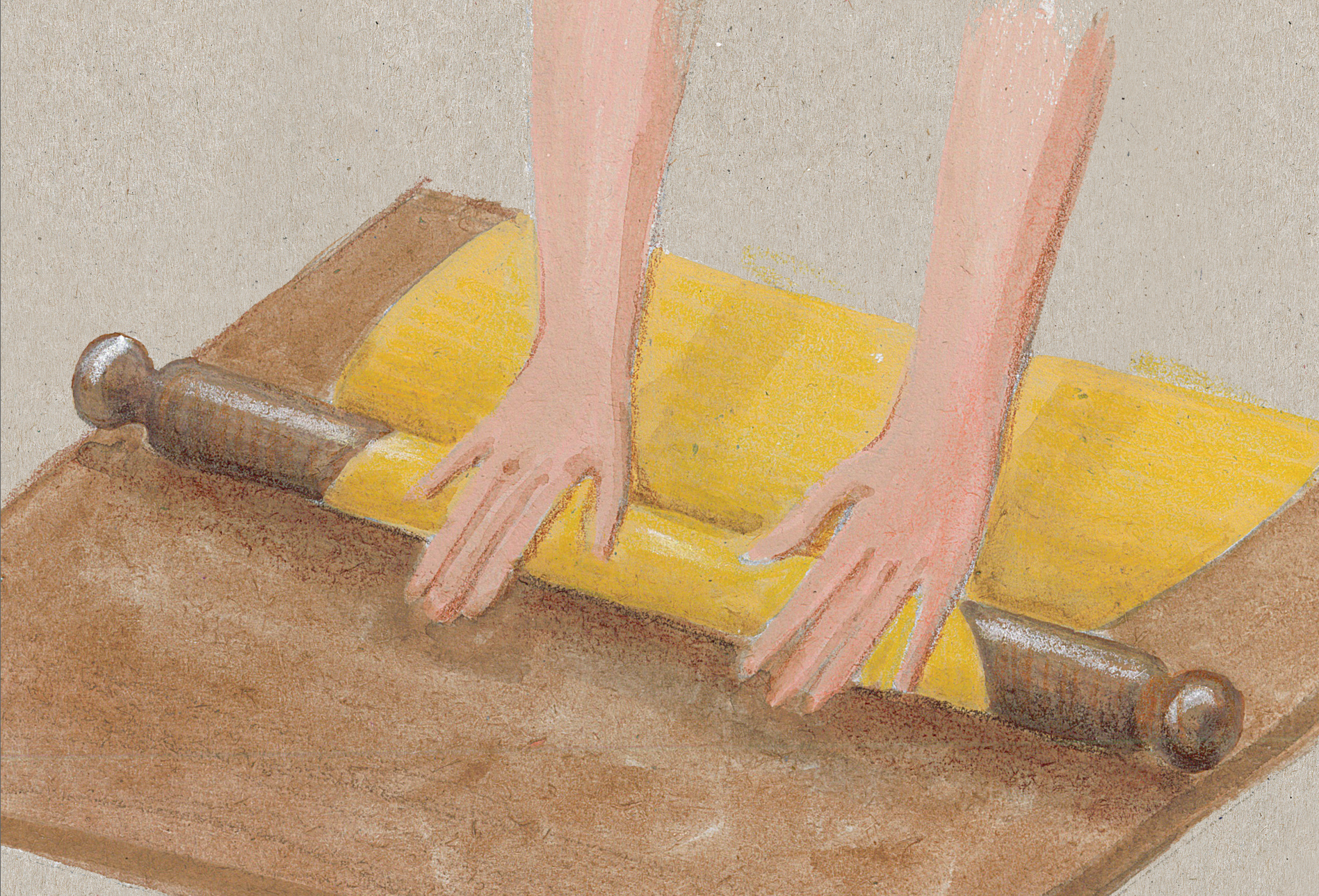 Farina, uova e un pizzico di sale, poi lasciarla riposare prima di tirarla rigorosamente a mano con il mattarello.
